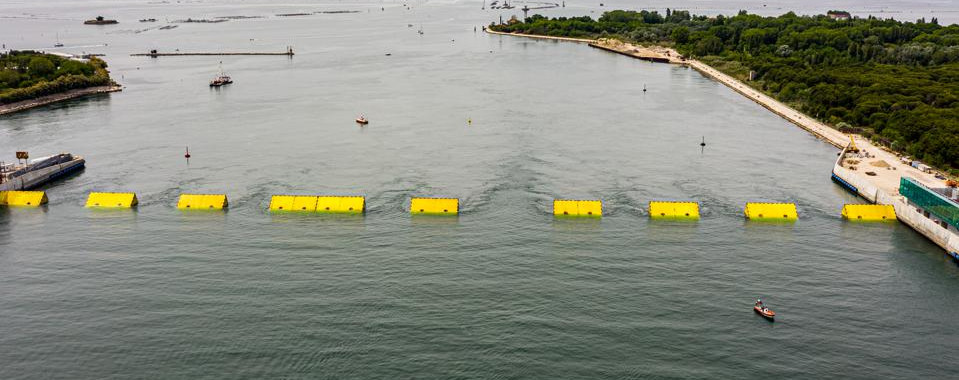 As barreiras MOSE consistem em comportas, instaladas no fundo das enseadas, que permitem a separação temporária da lagoa do mar nas marés altas.